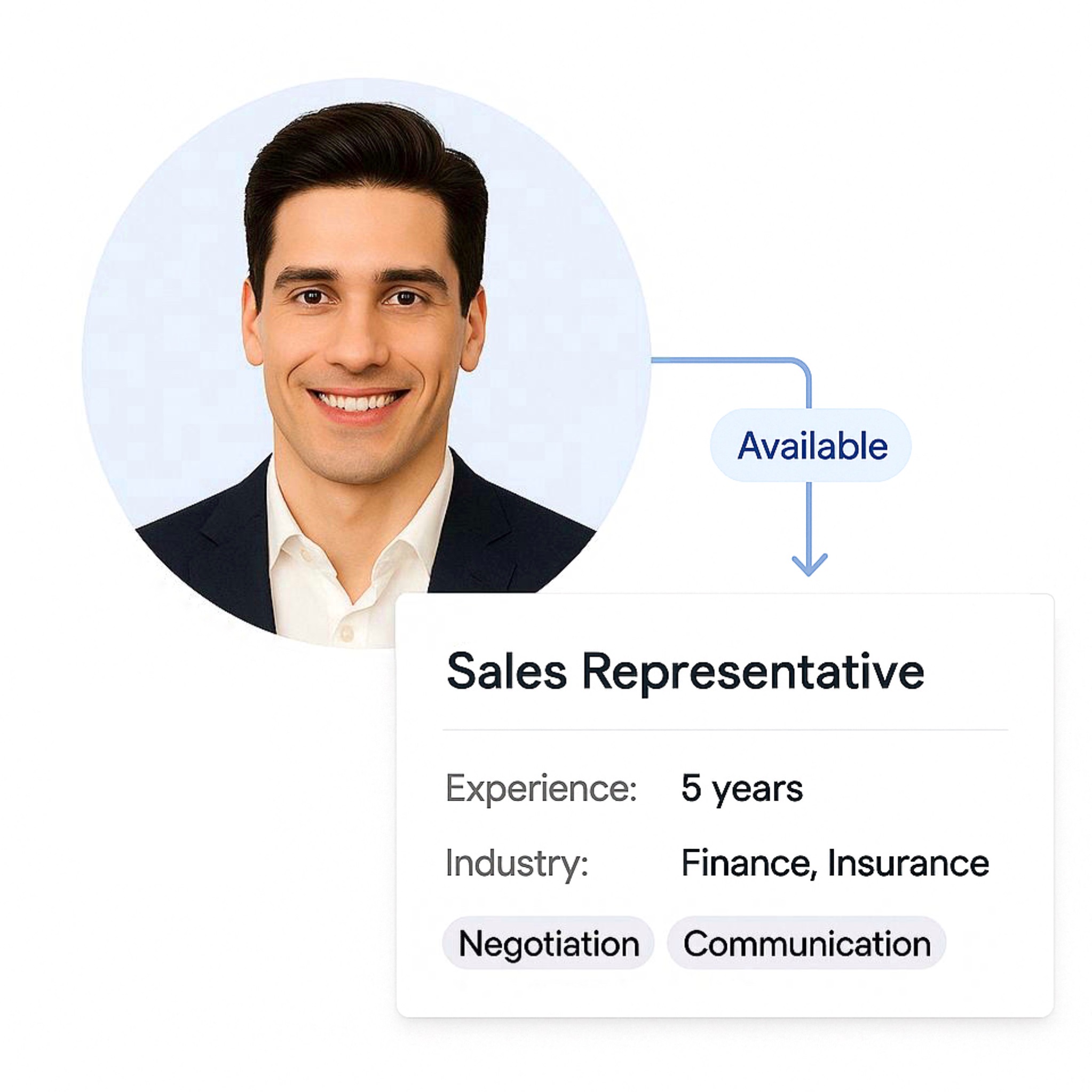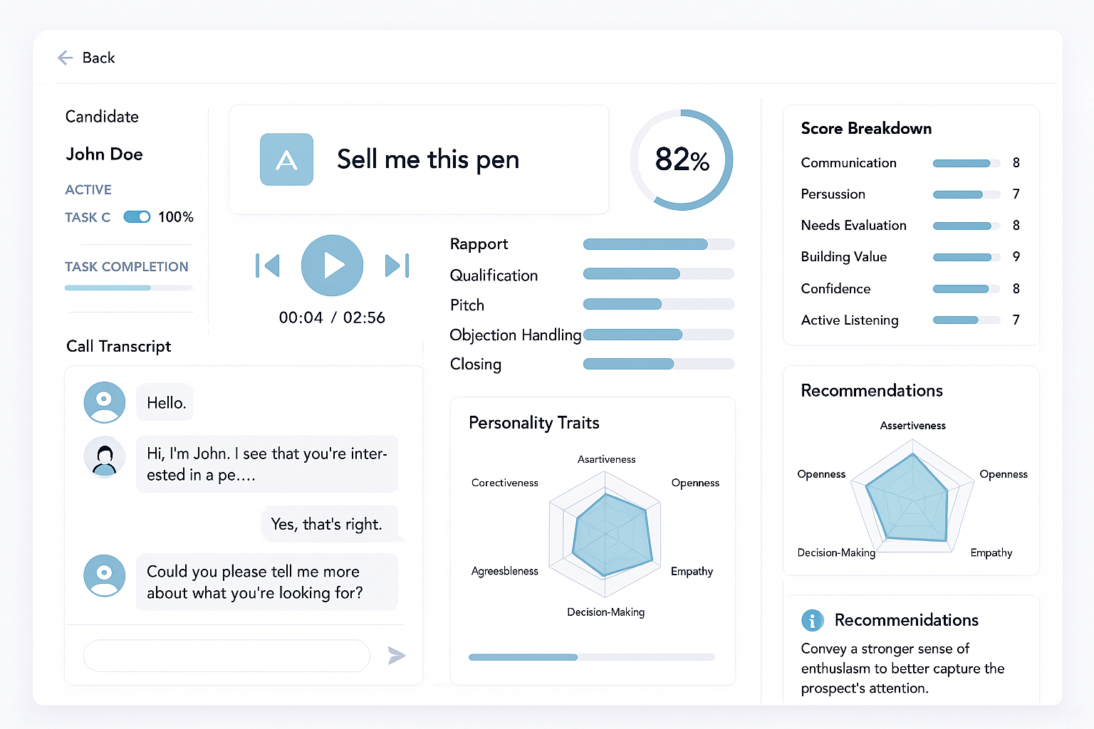Nuestra prueba «Véndeme este bolígrafo» ofrece un enfoque moderno para la selección de personal de ventas. Un agente de IA asume el papel de un cliente potencial que busca comprar un bolígrafo. La simulación de ventas es la mejor manera de evaluar las habilidades de venta y su aplicación práctica.